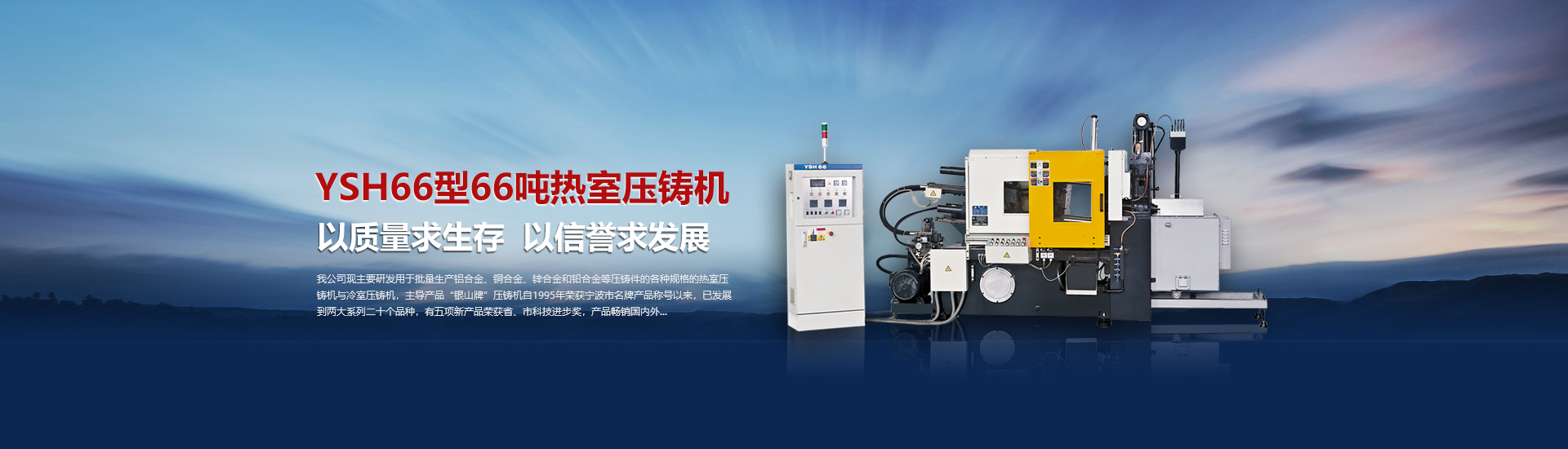 我司現主要研發用于批量加工生產鋁合金、銅合金、鋅合金和鉛合金等壓鑄件的各種型號規格的熱室/冷室壓鑄機,主導產品“銀山牌”壓鑄機自1995年榮獲寧波市名牌產品稱號以來,已發展到兩大系列二十個品種,有五項產品曾榮獲省、市科技進步獎,產品暢銷國內外。歷年來向用戶提供了8000余臺設備,為中國的壓鑄工業發展作出了重要的貢獻,企業獲得了很高的信譽度。